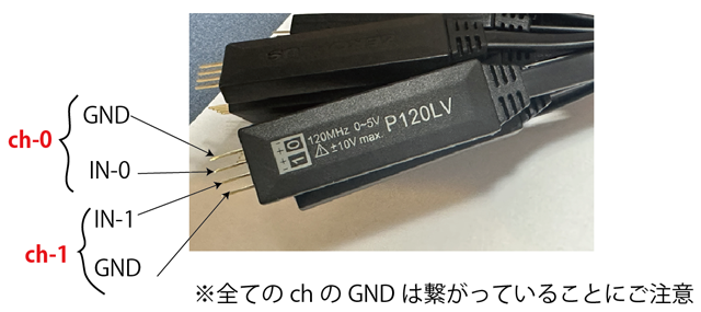 ・付属のプローブはP120LVというものになっています。このプローブは1本で2ch分の入力があります。端子が - + + - となっており、外側の - はGNDです。内側の + が信号の入力となります。シングルエンドで別々のchです。差動入力ではありません、