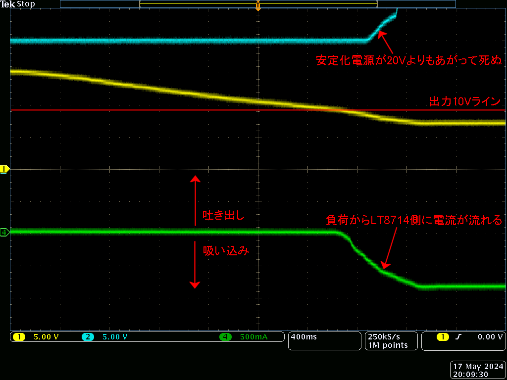 ・黄色のLT8714の出力電圧を下げていくと出力の10Vの電源よりも低くなり、出力の10VからLT8714に逆流してくることになります。